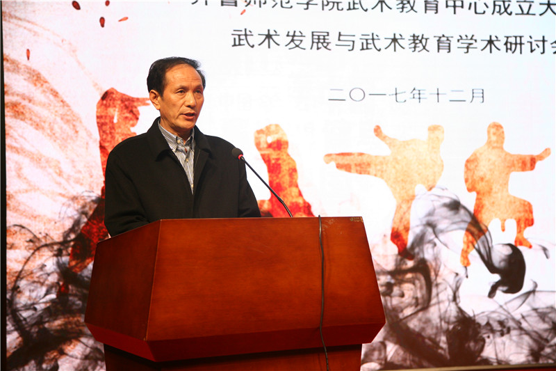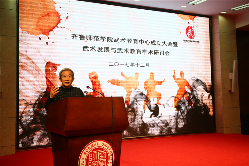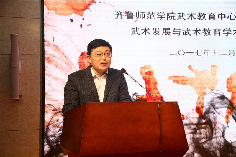 林松柏发表讲话,他指出高等学校的根本任务是“立德树人”,而武术正是在高等教育中发挥“立德树人”作用的良好载体。武术向来讲究武德,“尊师重道”、“重德尚义”、“扶危济贫”、“除暴安良”“助人为乐”,这些都是武术教育引导学生“见武明德”的重要准则,也对青少年学生培养正确的人生观、价值观、道德观有重要的指导意义。作为师范类院校,齐鲁师范学院一直致力于体育事业的发展,并取得了优异的成绩。成立武术教育中心,将聚集全校及团结国内外武术教育工作者和爱好者,继承和弘扬中华优秀传统文化,倡导和普及武术教育活动,开展武术育人理论研究与创新实践,为增强学生体质,培育学生健康体魄,促进社会主义物质文明和精神文明建设,提升文化自信水平服务。中心的成立将为全省武术教师的师资培养培训提供良好的平台,扎实有效地推进“武术进校园”工作的开展,也为我国、我省的教育、体育事业贡献力量。