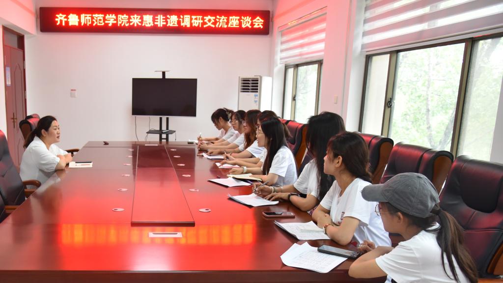 在惠民县文化馆非遗调研座谈会,惠民县文化馆郭晨曦馆长就当地非遗项目总体概括、发展现状、未来规划等方面作了具体介绍,并表达了与齐鲁师范学院文学与历史文化学院的合作意向。队员们对当地非物质文化遗产有了更加清晰的认识,进一步明晰了将来的研究方向,队员们表示将充分发挥新文科优势,积极作为、持续发力,为保护好传承好利用好黄河非遗贡献青春力量。