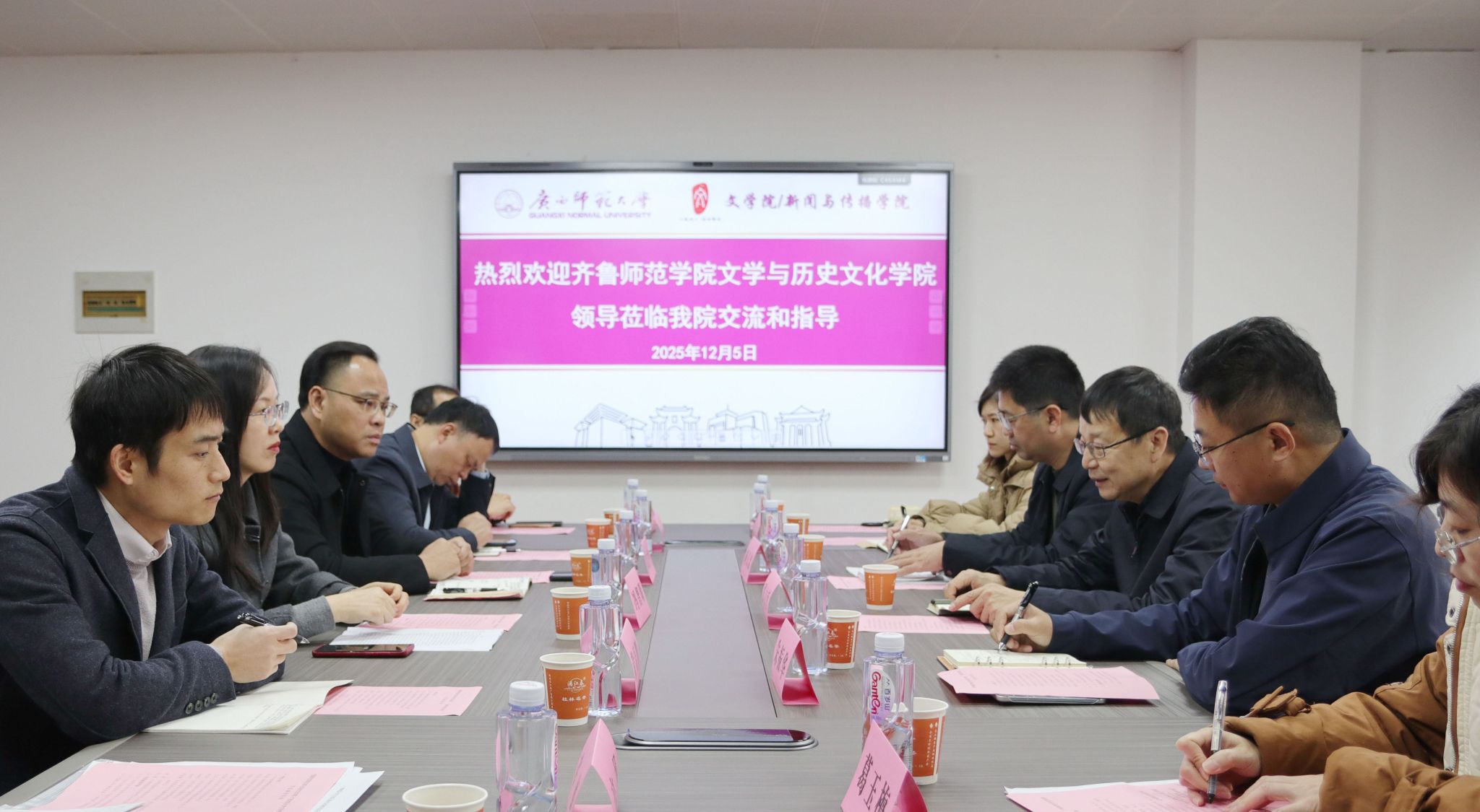 文学与历史文化学院党委书记胡义忠,院长张文哲,副院长、研究中心主任、教师第二党支部书记朱振华。广西师范大学文学院/新闻与传播学院党委书记邓志平,院长冯智明,副院长刘世文,政治与公共管理学院党委书记蒋菲,社会学与社会工作系教工党支部书记蔡慧玲,历史文化与旅游学院历史系主任江田祥,教师代表、博士生导师王本涛、吴双等分别出席交流活动。