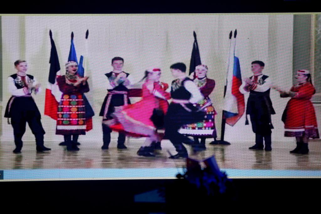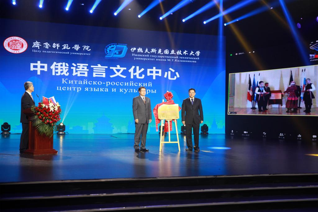 在齐鲁师范学院与伊热夫斯克国立技术大学中俄语言文化中心揭牌仪式环节,乌德穆尔特共和国能歌善舞的青年们热情表演了俄罗斯民族舞蹈,表达对该中心成立的庆贺。齐鲁师范学院党委副书记、校长秦梦华邀请孙业宝上台共同为两校中俄语言文化中心揭牌,同时,伊热夫斯克国立技术大学校长亚力山大·古柏特邀请乌德穆尔特共和国国家政策部长爱德华·彼得罗夫在云端同步揭牌,双方共同见证两校交流合作的重要时刻。